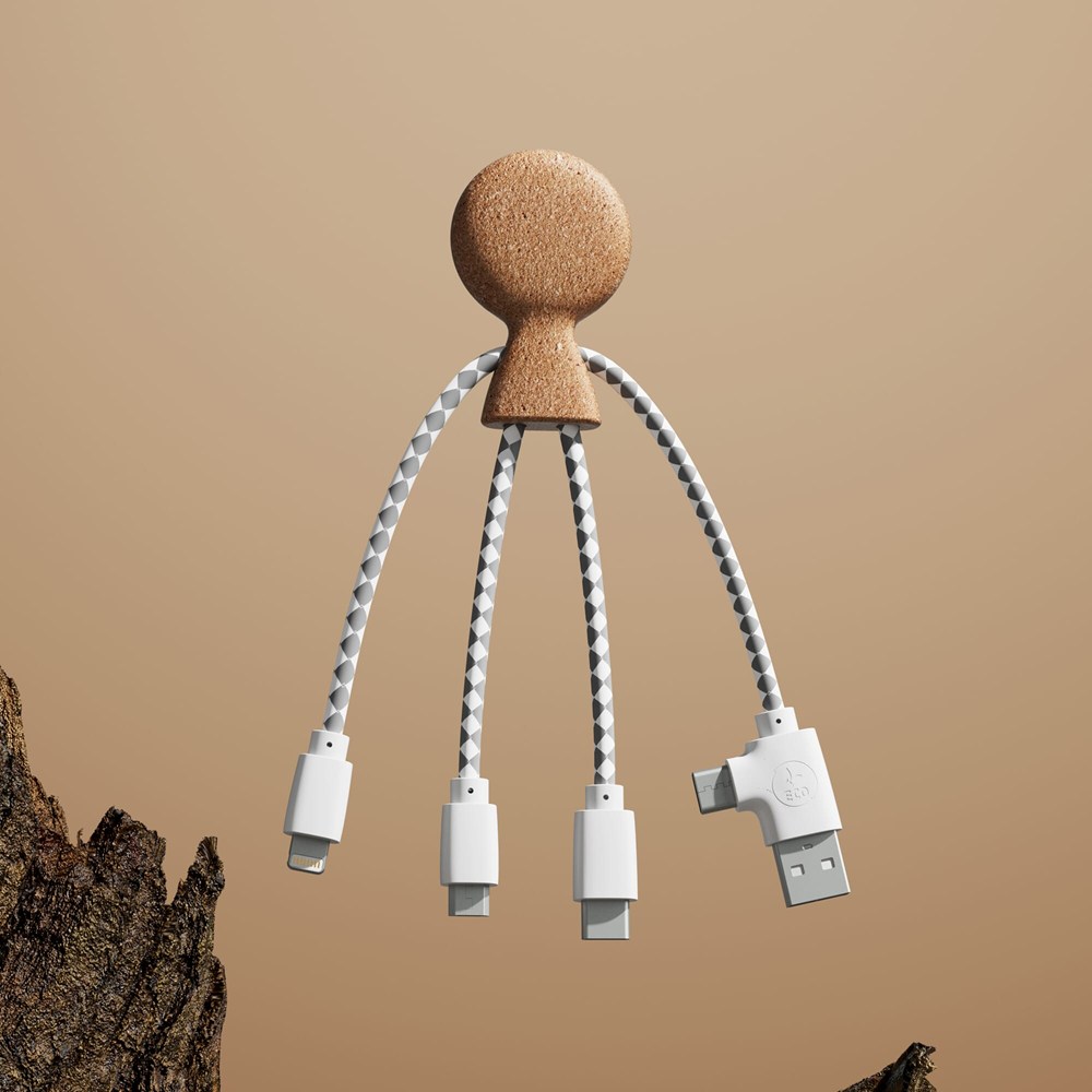 Mr. Bio Cork ist unser neuestes Multiladekabel mit einem dualen USB- und USB-C-Eingangsanschluss und drei Anschlüssen zum Laden Ihrer Geräte. Es ist aus Kork und DuPont Tyvek-Kabeln hergestellt. Es wird in einem eleganten, nachhaltigen FSC-Papierumschlag verpackt.