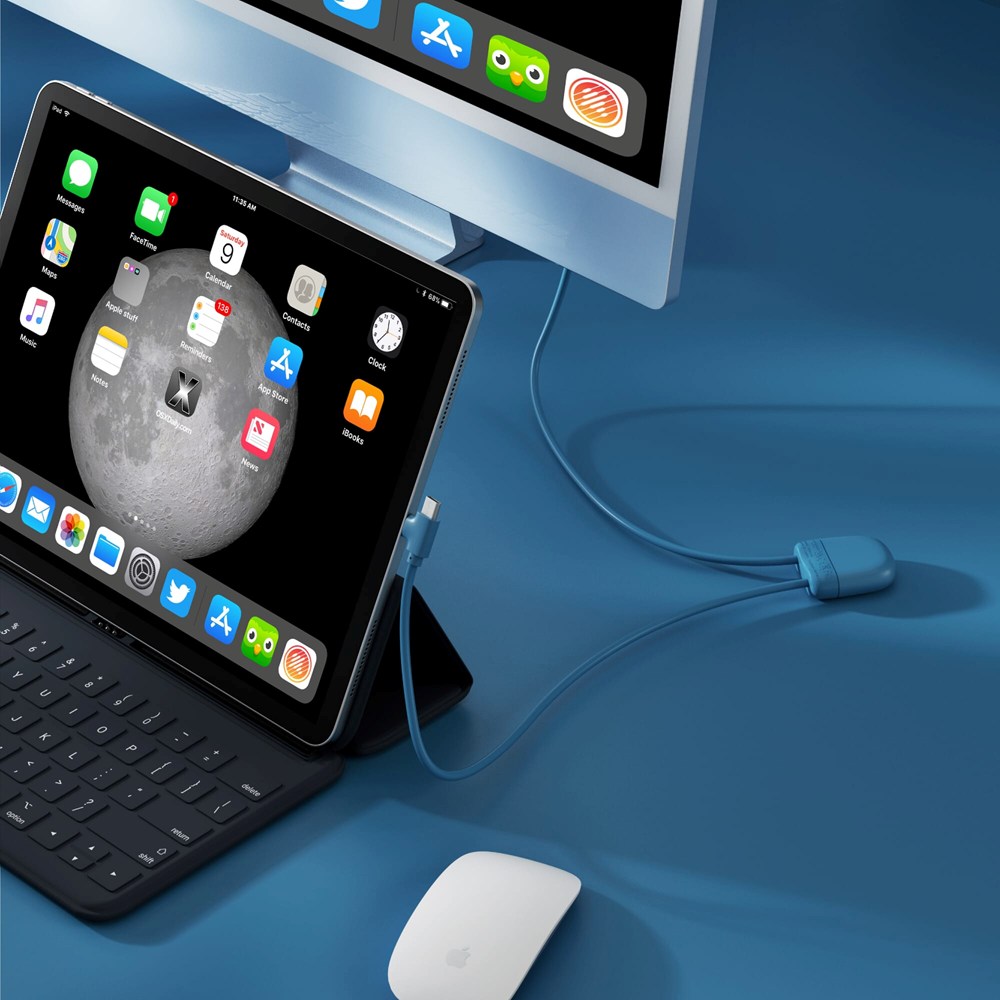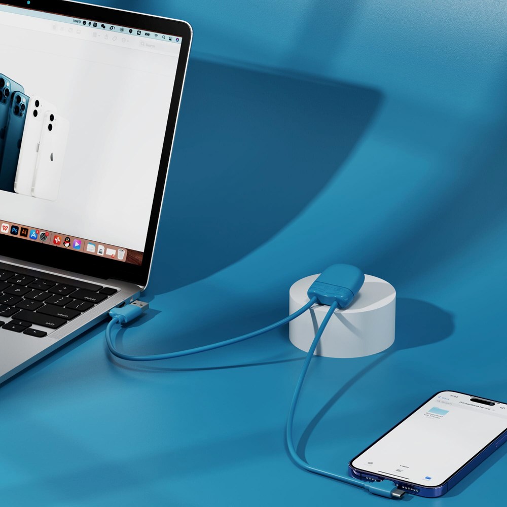 Das 27Watt ICE-C-Ladekabel ist unser neuestes Multiladekabel mit einem dualen USB- und USB-C-Eingang und einem dualen USB-C- und Lightning-Ausgang. Das Kabel hat eine Länge von zweimal 50 cm und unterstützt Datenübertragung und Car Play. Der Gesamtanteil an recyceltem Material beträgt 55 %, bezogen auf das Gewicht des Artikels. Das Kabel ist in einem nachhaltigen FSC-zertifizierten Papierumschlag verpackt.