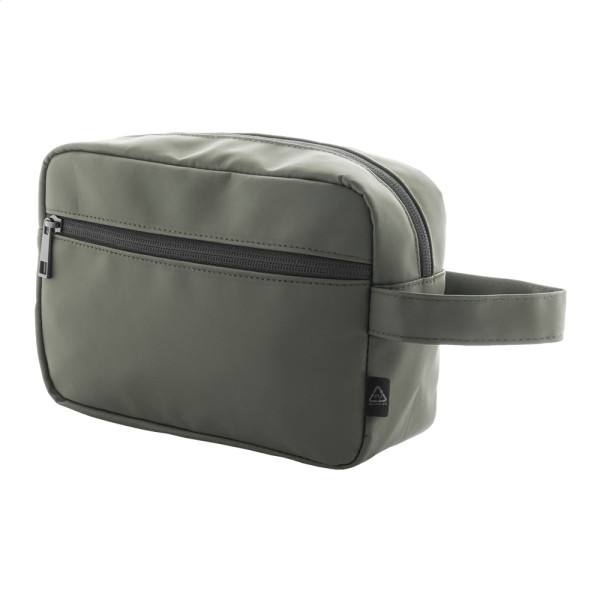 Weiche Kosmetiktasche aus recyceltem Kunstleder mit zwei Reißverschlußfächern, Tragegriff. Mit Label recyceltes Kunstleder.